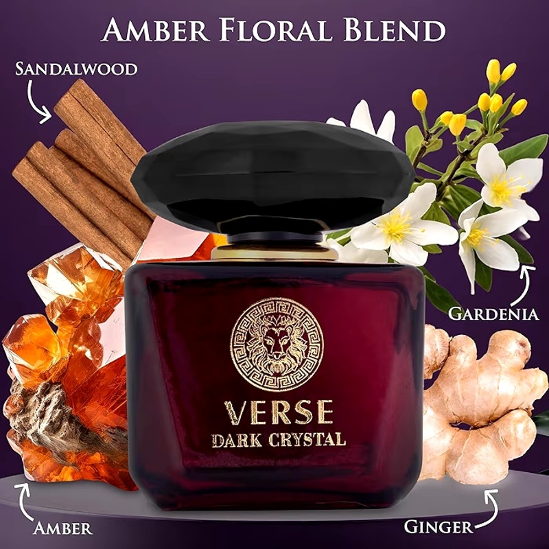 Amber Floral Blend: A sensual, delicate fragrance, Verse Dark Crystal opens with spicy top notes of pepper, ginger and cardamom, blended with a heart of coconut, gardenia, orange blossom and peony, and a warm sandalwood, musk and amber base.