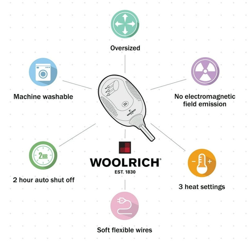Woolrich Elect Electric Blanket Throw with 3 Heat Level Setting Controller 60x70" Grey The Woolrich heated throw utilizes state of the art Secure Comfort heated technology that adjusts the temperature of your throw based on overall temperature, spot temperatures and the ambient temperature of your room, ensuring a consistent flow of warmth. This unique technology also emits virtually no electromagnetic field emissions, so you can snuggle up with confidence. This throw is oversized, nearly a foot larger in the length and width compared to standard heated throws. The ultra soft faux mink fabric and the lofty berber reverse creates a cozy, comfortable throw. Features 3 heat settings and 2 hour auto shut off. This throw is machine washable for easy care.